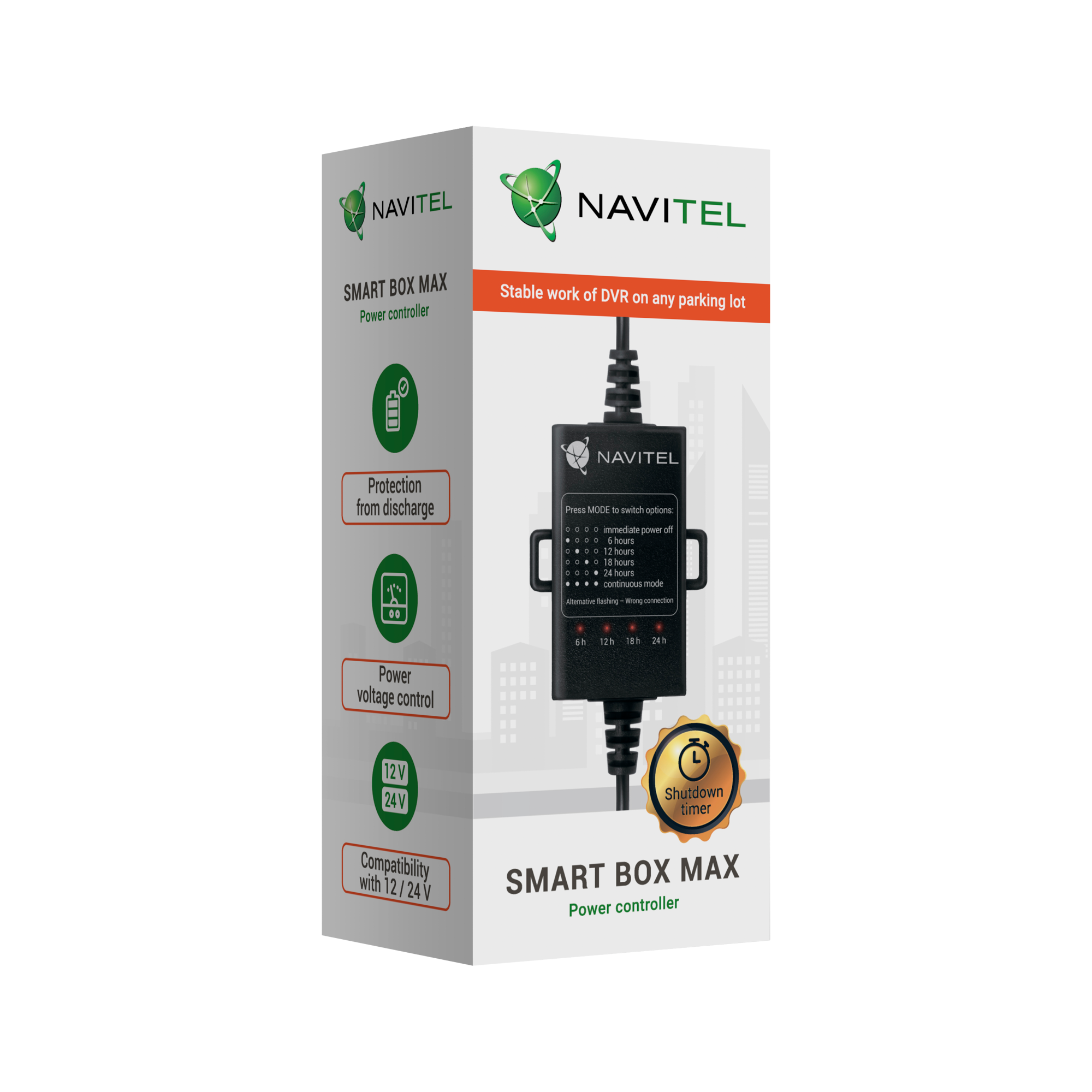 NAVITEL SMART BOX MAX chroni akumulator pojazdu przed całkowitym rozładowaniem, kontrolując jego pozostały czas pracy i napięcie. Adapter automatycznie wyłączy zasilanie rejestratora, gdy napięcie akumulatora spadnie do określonej wartości lub upłynie czas ustawiony przez użytkownika (w zależności od tego, co nastąpi wcześniej). Ponadto NAVITEL SMART BOX MAX chroni twój DVR przed skokami napięcia.<br />
