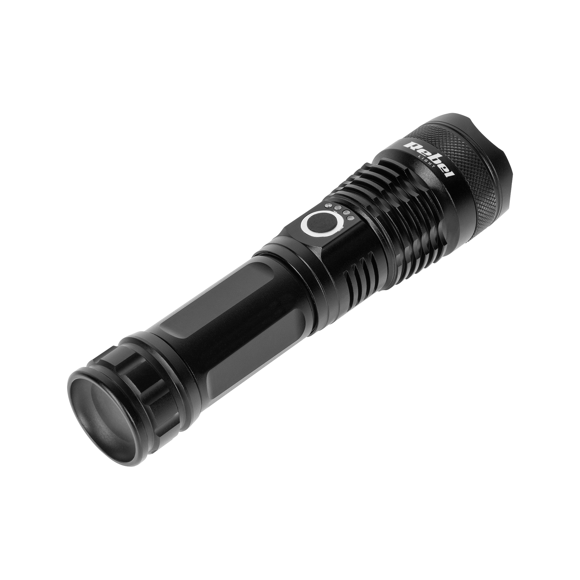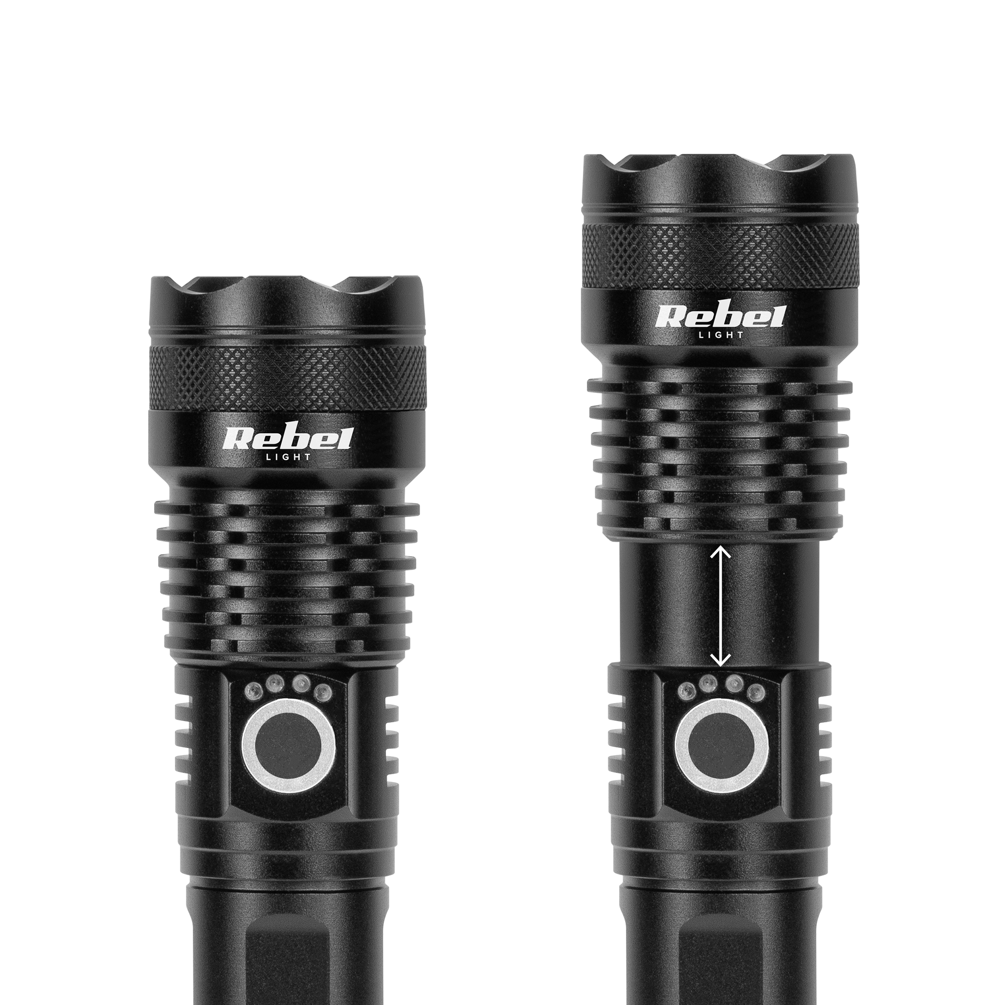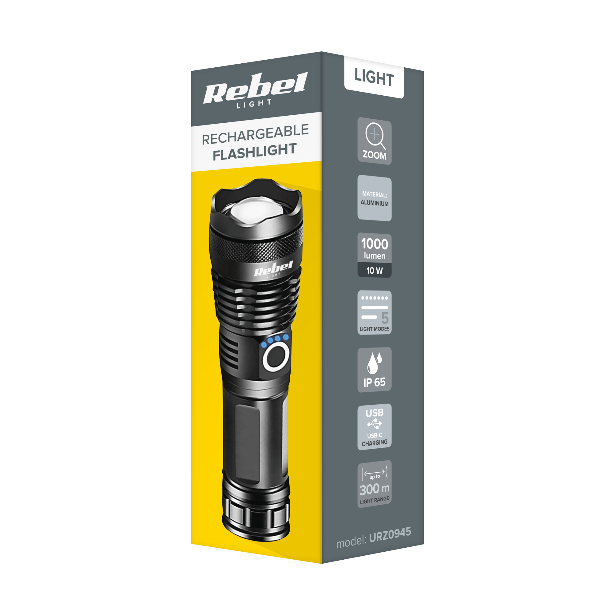<h2>Akumulatorowa latarka LED Rebel 10 W zoom aluminium 1000 lm IP65 USB-C</h2><p>Wykonana jest z wytrzymałego aluminium, co zapewnia jej solidność i odporność na uszkodzenia. Jest kompaktowa i lekka, ważąc jedynie 220 g, co czyni ją wygodną do trzymania i przenoszenia.</p>