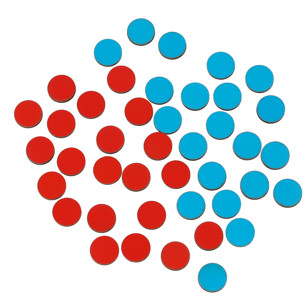 Każdy z graczy otrzymuje po 21 drewnianych żetonów w niebieskim lub czerwonym