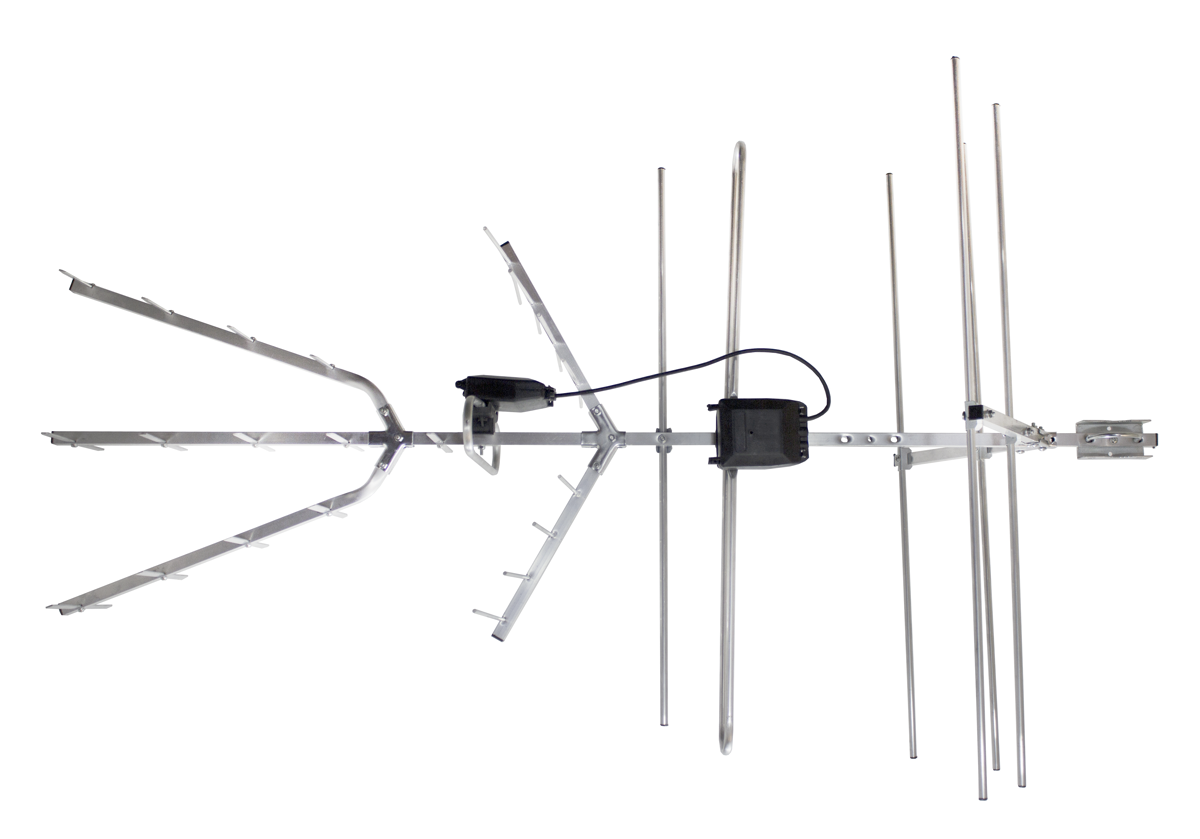 Antena VHF- tylna część- kanały 6-12 w puszce znajduje się zwrotnica antenowa z wyprowadzonym kablem który trzeba podłączyć do pierwszej części anteny czyli trii gdy włożymy do puszki symetryzator bądź wzmacniacz antenowy (nie jest dołączony wzmacniacz ani symetryzator), ta druga część ma możliwość pracy w polaryzacji poziomej lub pionowej. Kompatybilna z systemem DVB-T2.