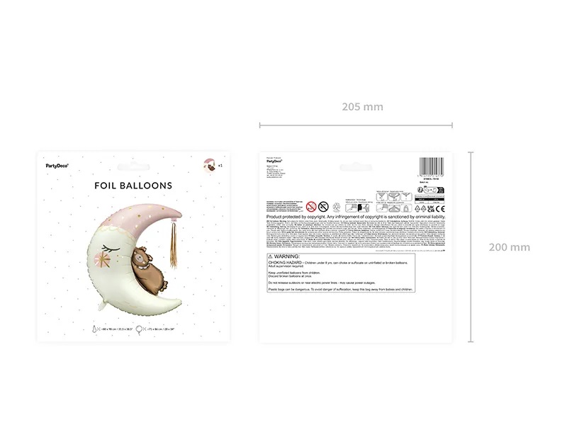 Uroczy balon foliowy – miś na księżycu. Oryginalny motyw balonu zachwyci każdego – niezależnie od wieku. Do napompowania powietrzem i helem. Zestaw zawiera słomkę oraz złoty frędzelek. Wymiary: 71 cm x 86 cm.