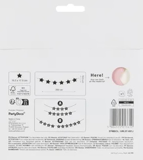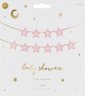 Baner w kształcie gwiazdek z napisem Baby Shower wykonany z papieru w kolorze jasnoróżowym. Dwie możliwości zawieszenia napisu. Wymiary: 90 cm x 16,5 cm.