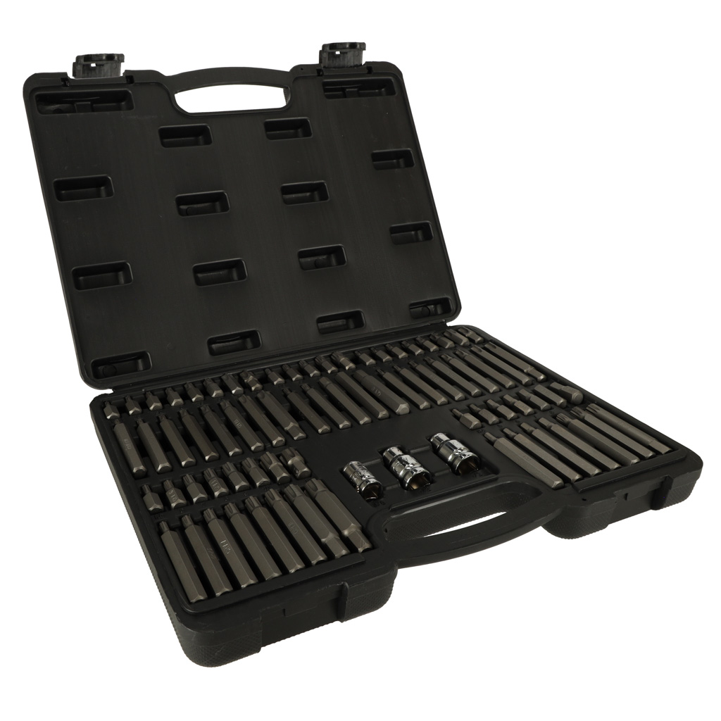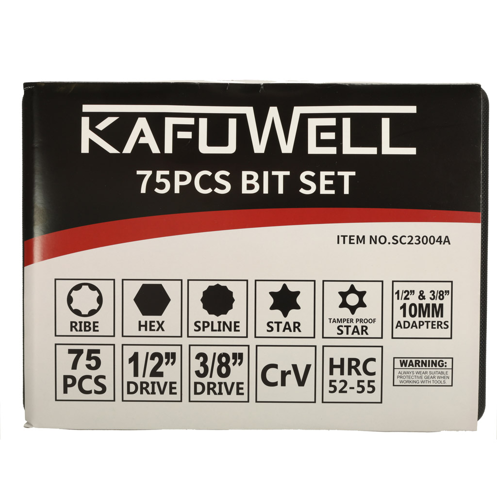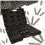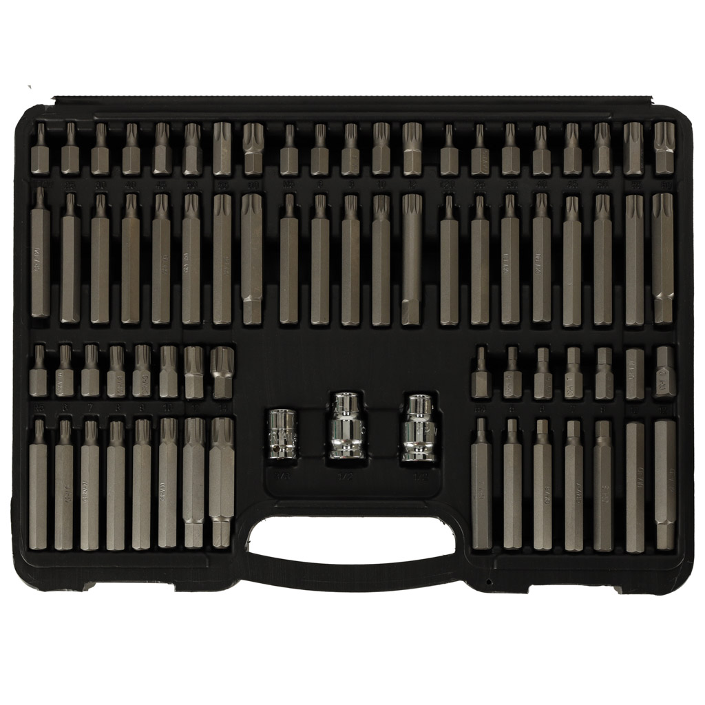 Zestaw bitów do wkrętarki – 75 elementów. Cztery rodzaje bitów – RIBE, HEX, SPLINE, STAR, TAMPER PROOF STAR. Zestaw zapakowany w poręczną walizkę. Tworzywo: stal chromowo-wanadowa. Bity krótkie – 3 cm, bity długie – 7,5 cm. Walizka: 37,5 x 28 x 6 cm.