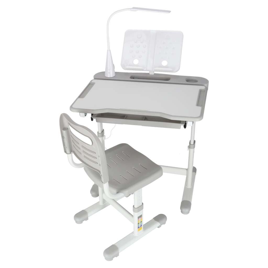 Szare biurko i krzesełko dziecięce z lampką LED do pokoju dziecka. Wysokość biurka jest regulowana od 53 do 71 cm, a krzesełka – od 30 do 42 cm. Ma otwierany blat, szufladę z przegródkami, podstawkę na książkę, a także miejsce na napój i plecak.