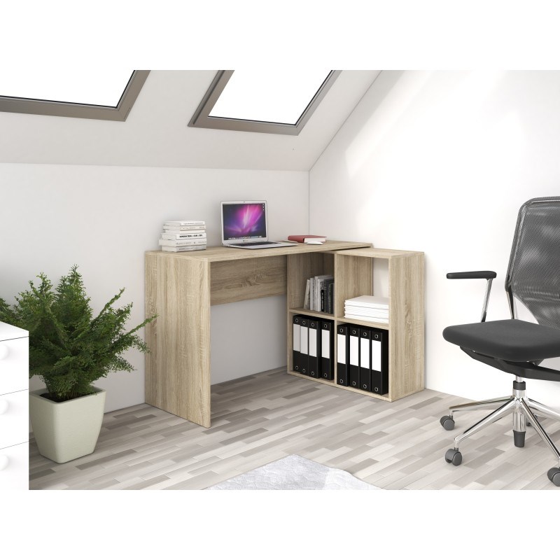 Płyta wiórowa laminowana wyróżnia się odpornością na naprężenia mechaniczne i ekstremalne temperatury, Meble do samodzielnego montażu, Gładkie boki bez zaślepek i widocznych otworów, Zdjęcia zestawów przedstawiają przykładową aranżację z innymi meblami z kolekcji. Pozostałe bryły są dostępne w osobnej sprzedaży., Obrzeża – wykończone tworzywem PCV (charakteryzującym się dużą wytrzymałością mechaniczną i chemiczną), Biurko Plus dostępne w sprzedaży także bez regału/komody