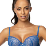 Kuszący biustonosz push-up Frances w kolorze beżowo- granatowym. Miseczki w kolorze granatowym podszyte beżową bawełną z wyjmowanymi wkładkami push-up. Boczki z siatki elastycznej. Po środku kokardka. Ramiączka nieodpinane, regulowane. Haftka dwurzędowa z trójstopniową regulacją.