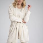 Luźna narzutka bez zapięcia wiązana paskiem, z przodu naszyte duże kieszenie.
