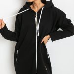 Bluza damska o przedłużonym kroju, z długim rękawem oraz kapturem. Bluza zapinana na zamek, po bokach kieszenie wsuwane również zapinane na zamki.