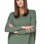 Wygodna bluza z dzianiny bawełnianej o szerokim fasonie, typu kimono. Rękaw długi, dekolt w łódkę. Tył delikatnie przedłużany.