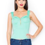 Top a la gorset na szerokich ramiączkach, profilowane miseczki, z przodu krótki zamek błyskawiczny. Niezwykle seksowna propozycja, doskonale prezentować się będzie zarówno z obcisłymi spódnicami jak i jeansami. Model dostępny w trzech wersjach kolorystycznych.