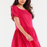 Krótka bluzka z szyfonu składająca się z dwóch falban i rękawków, cały dekolt ma wszytą gumkę.