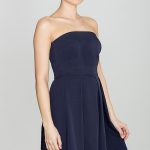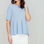 Lekko oversizeowa forma pozwala tuszować niedoskonałości figury. Linia z delikatnie dłuższym tyłem, krótkie rękawy wykończone mankietem. Dekolt okrągły, blisko szyi, zapinana z tyłu na kryty suwak. Z przodu kontrafałdy.