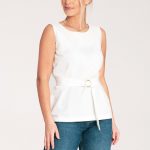 Bluzka zakładana przez głowę z długim rękawem. Okrągły dekolt dopasowany do szyi. Tył minimalnie dłuższy. Wycięcie na plecach wykończone falbanką.
