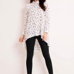 Bluzka z krótkimi rękawkami i falbanką u dołu. Bluzka z materiału ecru w ptaki.