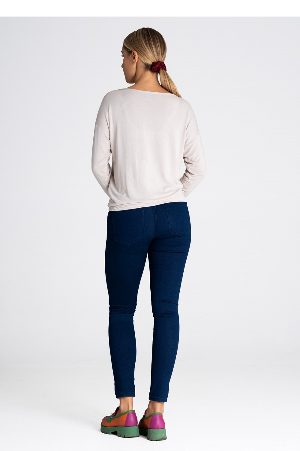 Bluzka z delikatnej tkaniny z długim rękawem oraz okrągłym dekoltem. Luźny fason z opadającym ramieniem. W dole wszyta gumka.