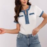 Dopasowana bluzka damska w casualowym stylu to świetny wybór na co dzień. Wykonana z miękkiej bawełny z dodatkiem elastanu, doskonale dopasowuje się do sylwetki, zapewniając wygodę i swobodę ruchów. Klasyczny dekolt w serek podkreśla kobiecy charakter, a krótkie rękawy sprawiają, że bluzka jest uniwersalna na każdą porę roku. Wyjątkowym akcentem jest wykończenie z jeansowego materiału, które dodaje jej oryginalności i lekkości. Standardowa długość sprawia, że bluzka świetnie komponuje się zarówno z jeansami, jak i spódnicami, tworząc stylowe i komfortowe zestawy na co dzień.