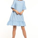 Bluzka z delikatnej dzianiny. Podkroje pach wykończone ściągaczem. Dół pozostawiony w stanie surowym. Przy dekolcie przedłużana stójka, którą można wiązać na różne sposoby.