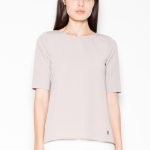 Elegancka bluzka z krótkim rękawem o asymetrycznym kroju. Charakteryzuje się wycięciem z tyłu, pięknie podkreślającym plecy. Bluzka świetnie komponuje się z dopasowanymi spodniami.