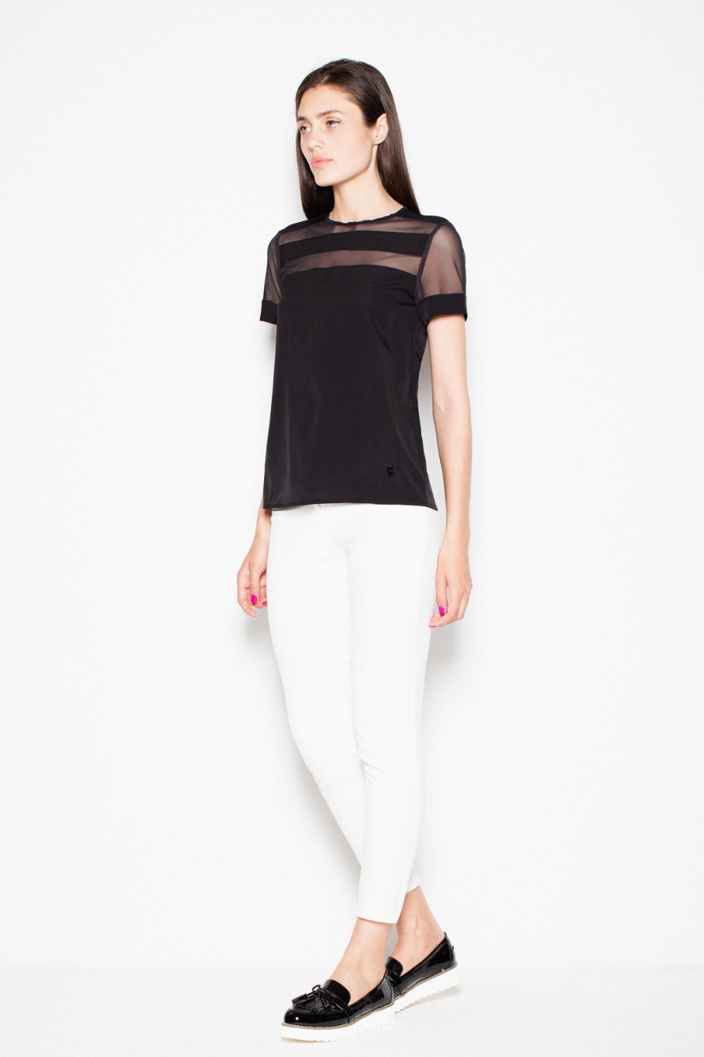 Szykowna bluzka z krótkim rękawem z półokrągłym dekoltem. Posiada ozdobne, prześwitujące elementy przy dekolcie i rękawach. Model wykonany z doskonałej jakości materiału.