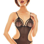 Zjawiskowe, mega seksowne, czarne body wykonane z elastycznego tiuli i intrygująco haftowanej koronki. Model z wycięciami po bokach, z paskami na plecach i na pośladkach, emanujący seksapilem. Tkanina miękka i prześwitująca. Góra w wersji soft, bez fiszbin. Ramiączka w regulowanej długości.