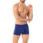 Męskie bokserki w kolorze jeansowym. Bokserki wykonane są wysokiej jakości delikatnej, miłej w dotyku bawełny z dodatkiem elastycznego włókna lycry. Lycra to skład, który zwiększa elastyczność bokserek, zapobiega rozciąganiu się materiału i deformowaniu. Bokserki dobrane odpowiednio do rozmiaru sylwetki są bardzo wygodne w użytkowaniu, idealnie przylegają do męskiej sylwetki. Krótkie nogawki mocniej przylegają do ud i są wykończone delikatnym szwem. Bokserki są bardzo popularne wśród mężczyzn i chętnie przez nich nabywane. Bokserki nie posiadają zdobień, wzorów i aplikacji, są gładkie i klasyczne w kroju. W pasie w przedniej części bokserki zdobi delikatne logo firmy, ponadto w pasie wszyta jest elastyczna gumka, która nie odznacza się i nie zostawia śladów na skórze i zapobiega zsuwaniu się bokserek. Klasyczne jeansowe bokserki sprawdzą się pod każdymi spodniami dopasowanymi slimami i z luźniejszymi nogawkami. W okolicach kroku w przedniej części bokserki posiadają pionowe cięcie, które mocniej przylega do miejsc intymnych. Bokserki prane w odpowiedniej temperaturze zachowają swoją żywotność na długi czas.
