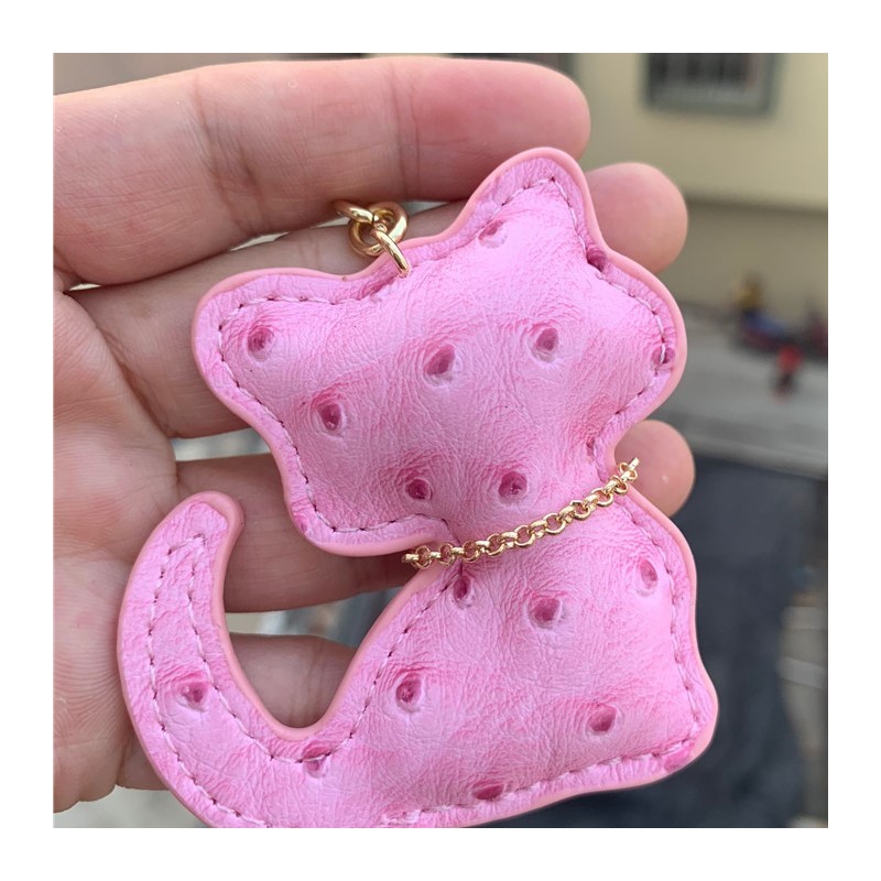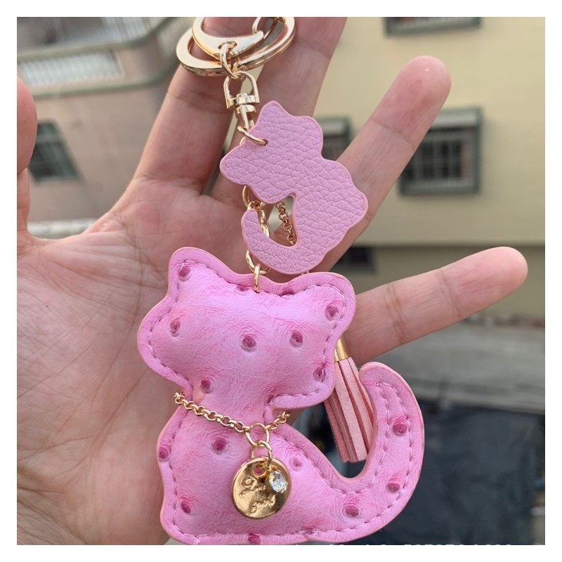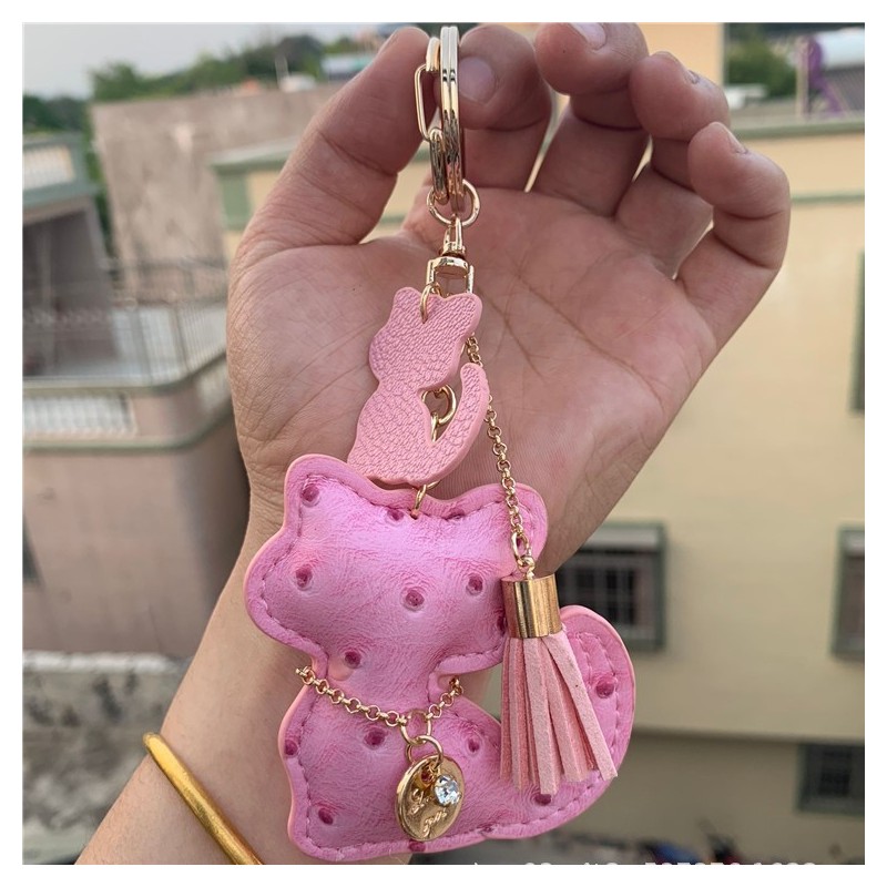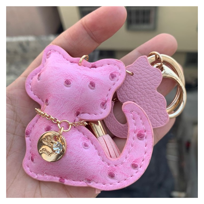 Brelok do kluczy skórzany KOTEK różowy, frędzle BRL358