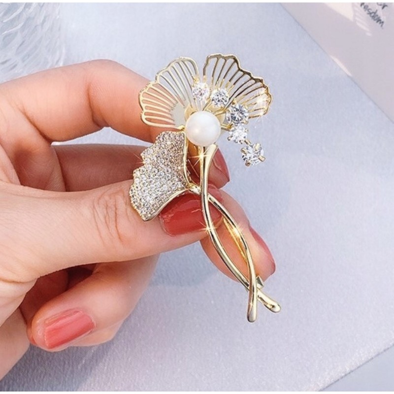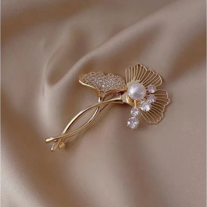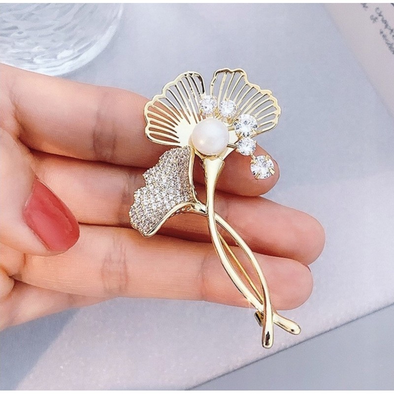 Broszka ozdobna – miłorząb z cyrkoniami i perłą BZ215