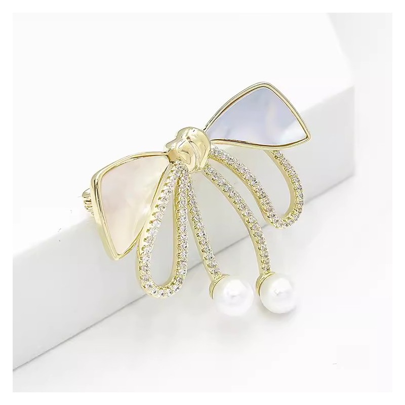 Broszka ozdobna złota KOKARDKA masa perłowa i cyrkonie BZ197