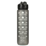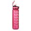 Tritanowa butelka na wodę w różowym kolorze. Posiada ustnik ze słomką oraz zabezpieczenie przed przypadkowym otwarciem się. Nadrukowana skala z godzinami i hasłami przypomina o regularnym piciu wody. Pojemność: 1 litr. Wymiary: 28,5 cm x 7,5 cm.