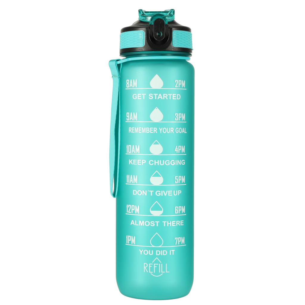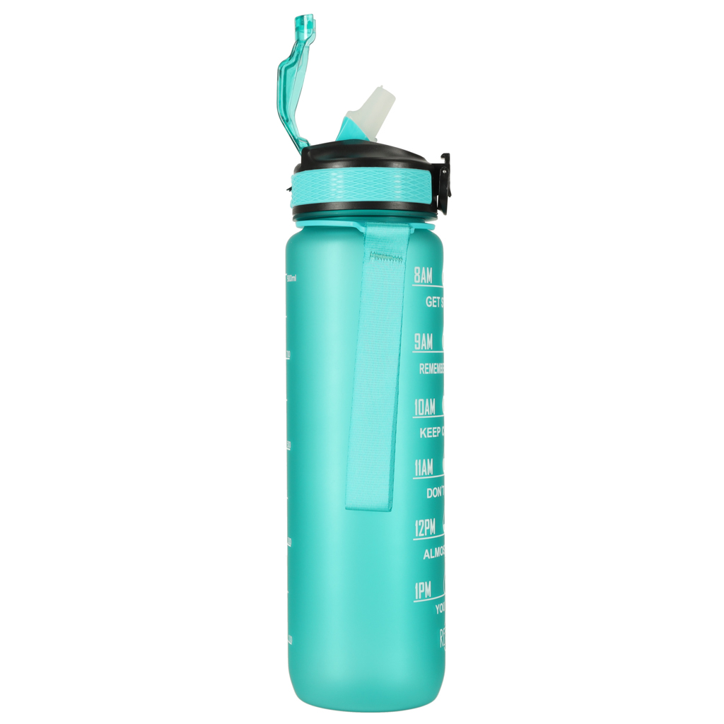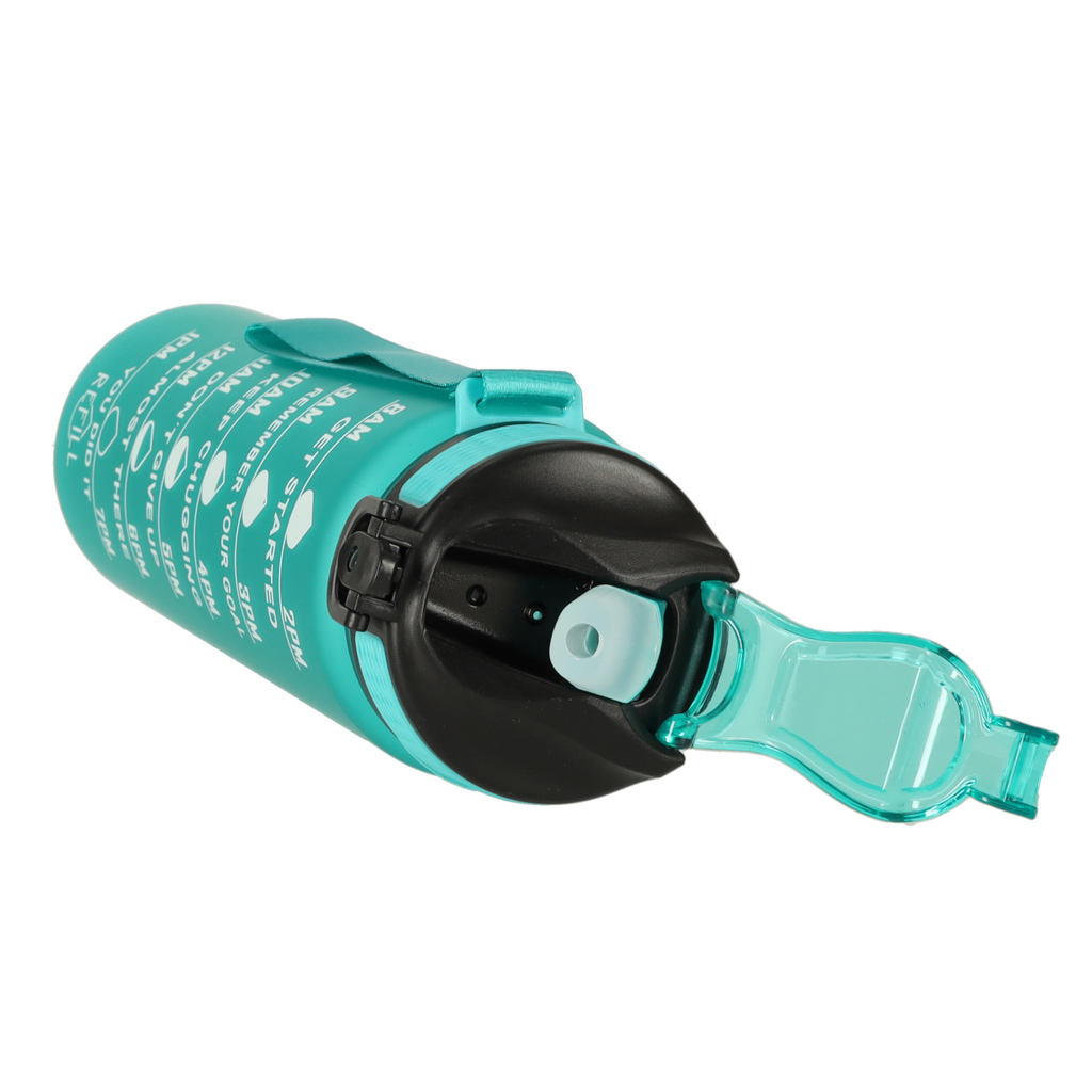 Tritanowa butelka na wodę w zielonym kolorze. Posiada ustnik ze słomką oraz zabezpieczenie przed przypadkowym otwarciem się. Nadrukowana skala z godzinami i hasłami przypomina o regularnym piciu wody. Pojemność: 1 litr. Wymiary: 28,5 cm x 7,5 cm.