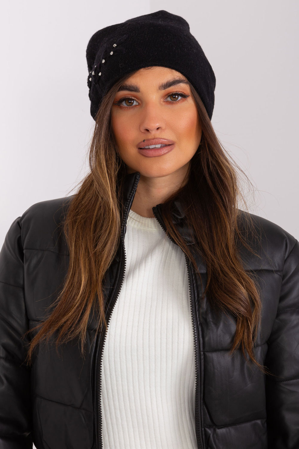 Ciepła zimowa czapka damska z gładkiej dzianiny z ozdobną aplikacją na boku.