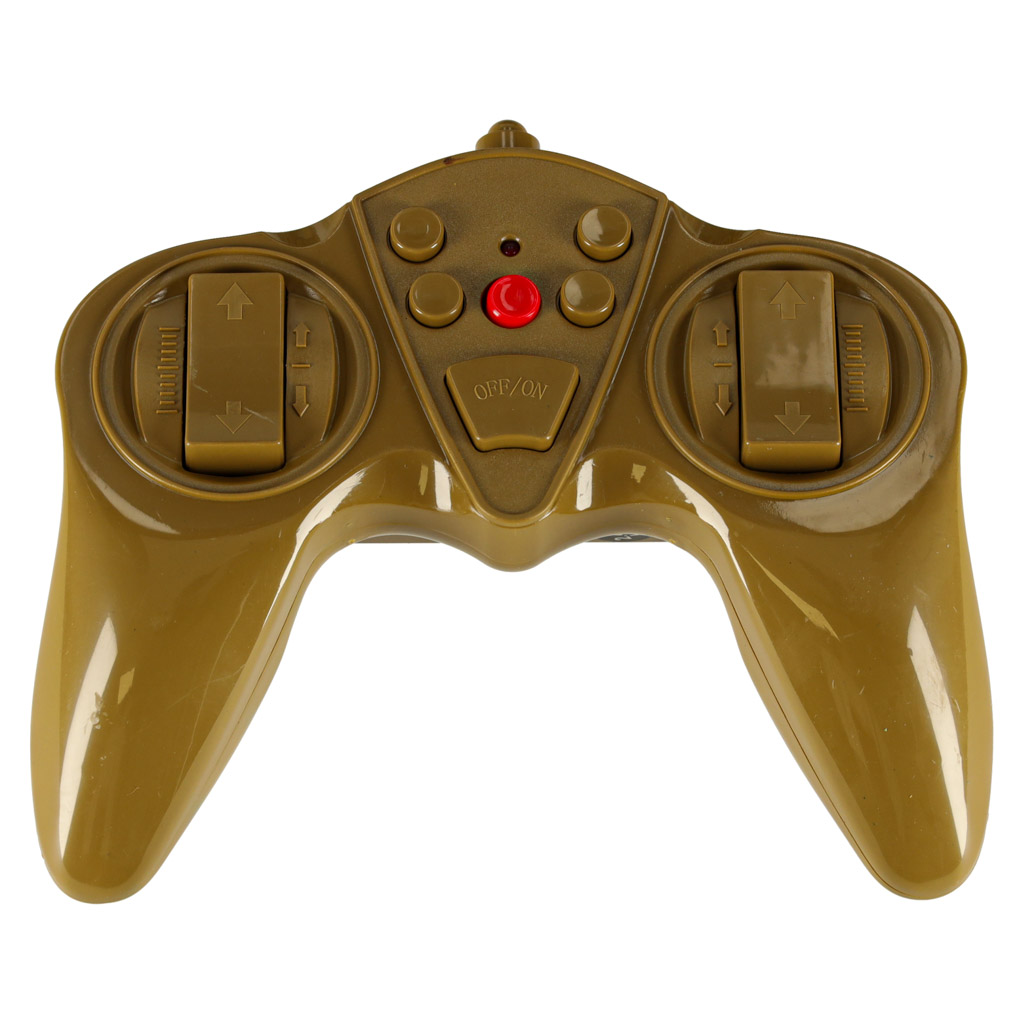 Jazda w każdym kierunku. Dźwięki strzałów i silnika, oświetlenie. Zdalnie obracana wieżyczka. Czołg w 2 kolorach i mogą walczyć na podczerwień. Zasilanie: akumulator Ni-Cd N4,8V 700mAh, bateria 9V. Wymiary: 38x21x15cm.