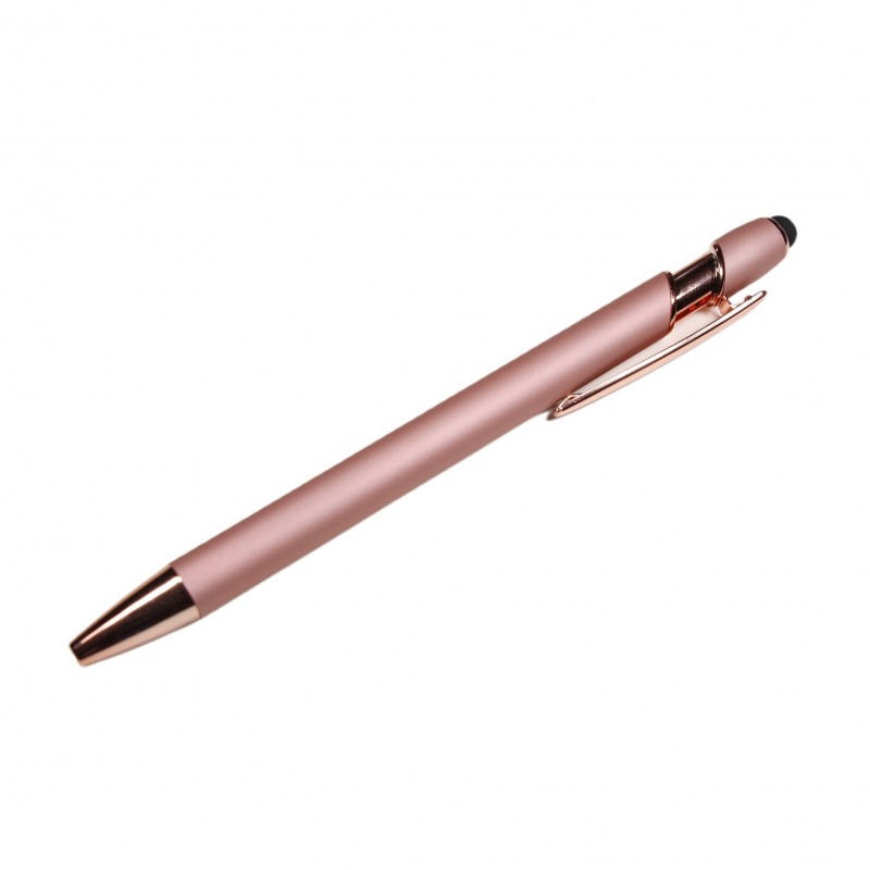 Metalowy długopis z powierzchnią soft touch, różowo złotymi elementami, czarnym wkładem i końcówką touch pen. Specyfikacja: Kolor długopisu: Różowy