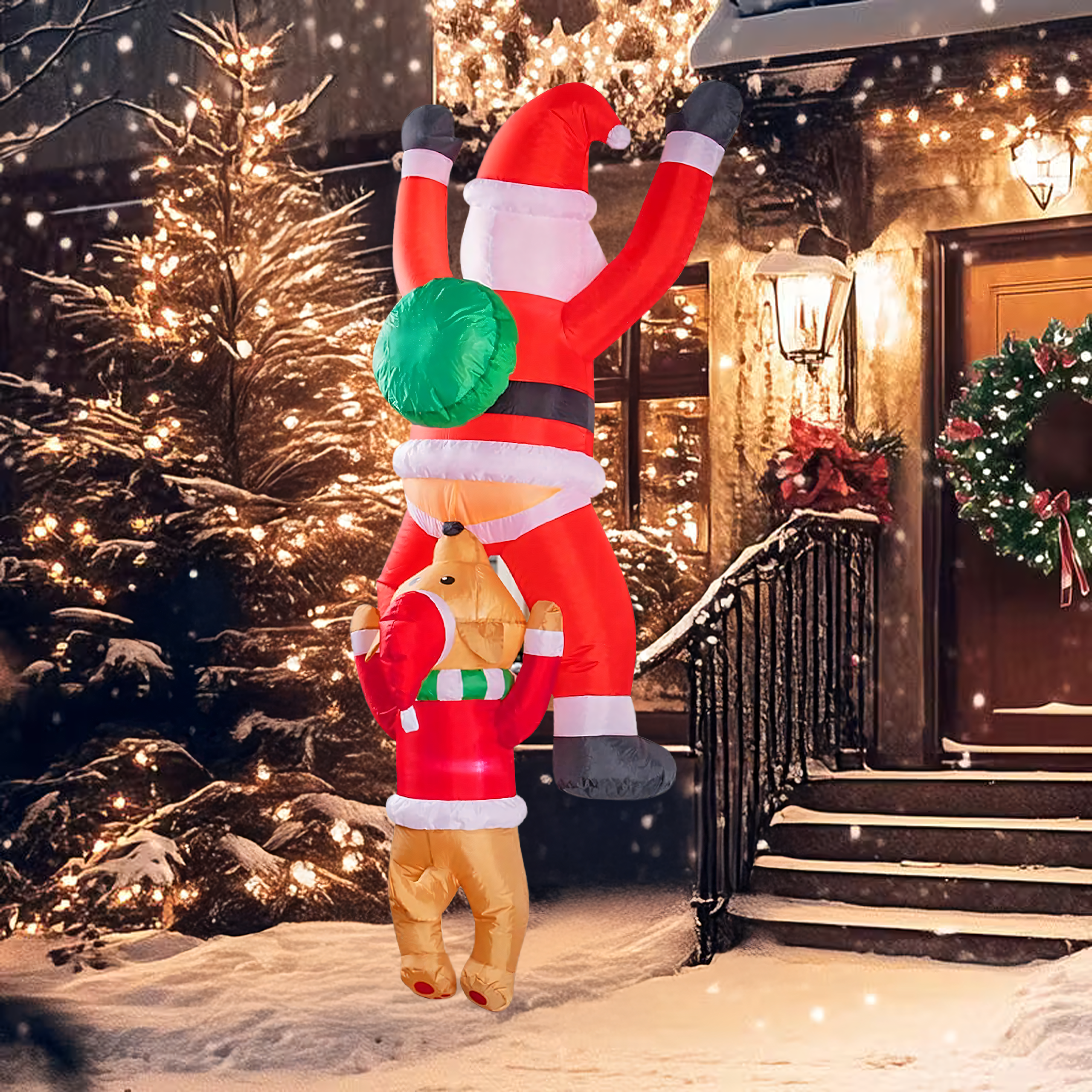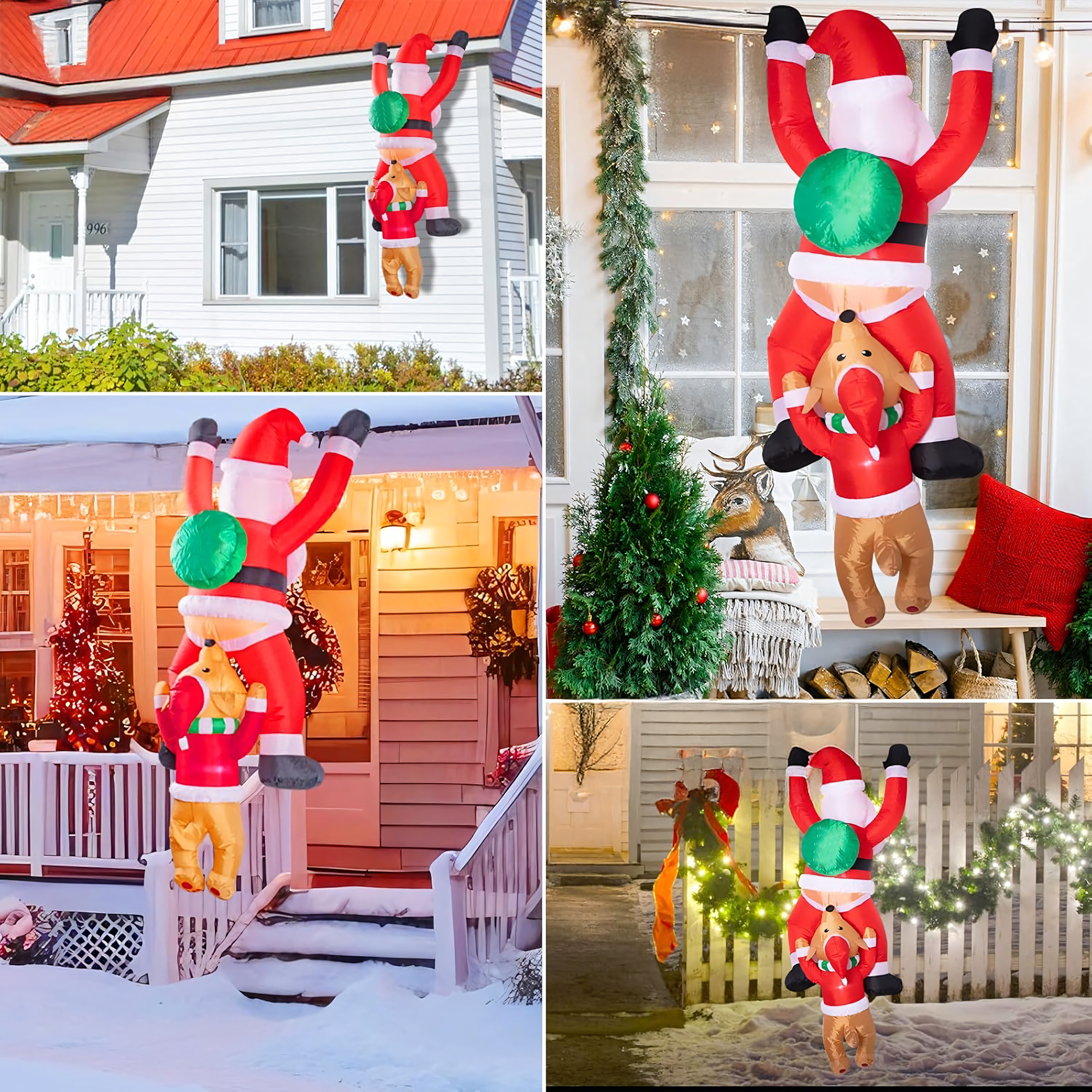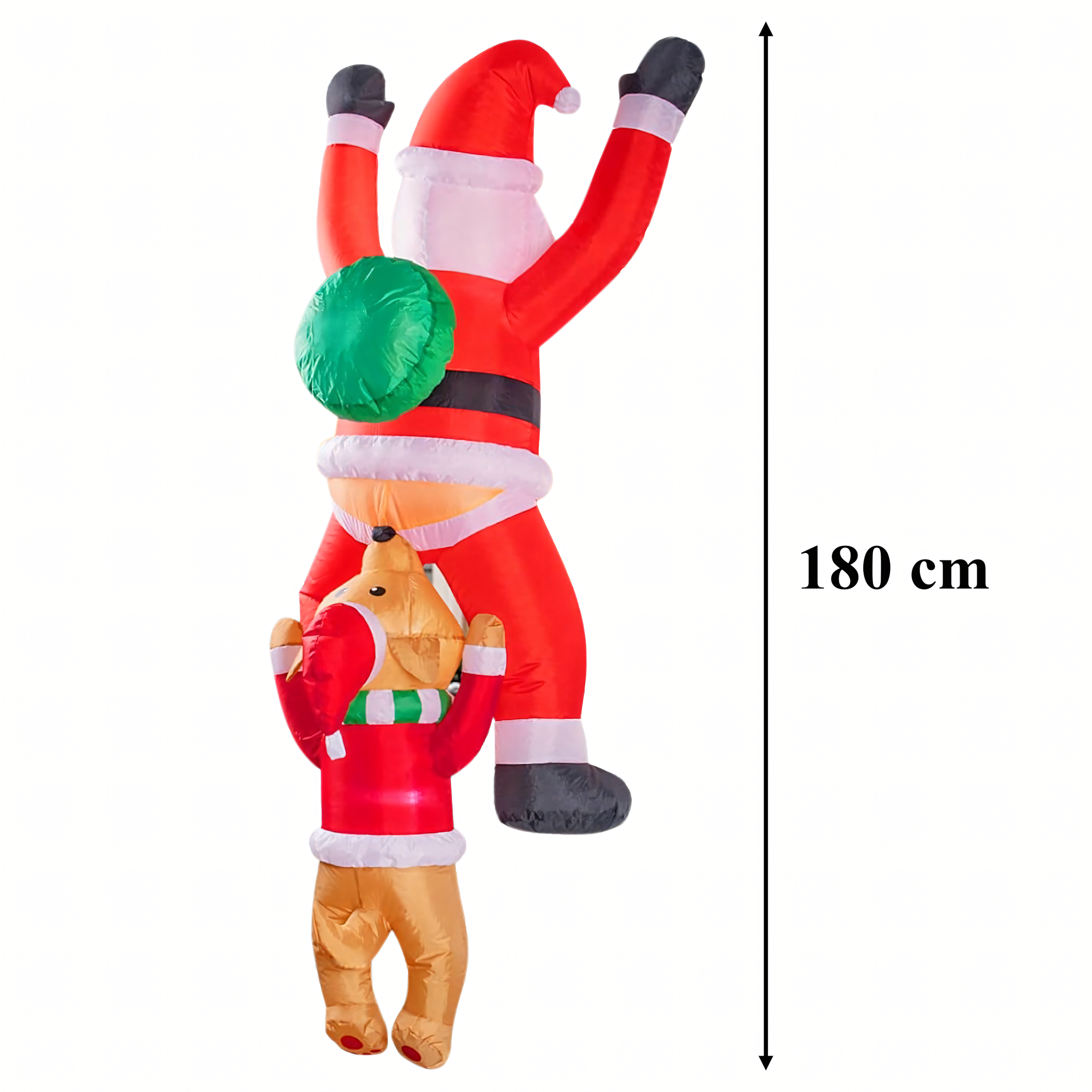 Dmuchany Święty Mikołaj zwisający z Reniferem 1,8 m to nietypowa, zabawna dekoracja świąteczna, która wniesie do Twojego domu i ogrodu wyjątkowy klimat. Dzięki wbudowanemu podświetleniu LED i kreatywnemu projektowi przyciąga spojrzenia i budzi uśmiech zarówno u dzieci, jak i dorosłych. Wykonana z wytrzymałej tkaniny poliestrowej, odpornej na warunki atmosferyczne – idealna do wnętrz i na zewnątrz.