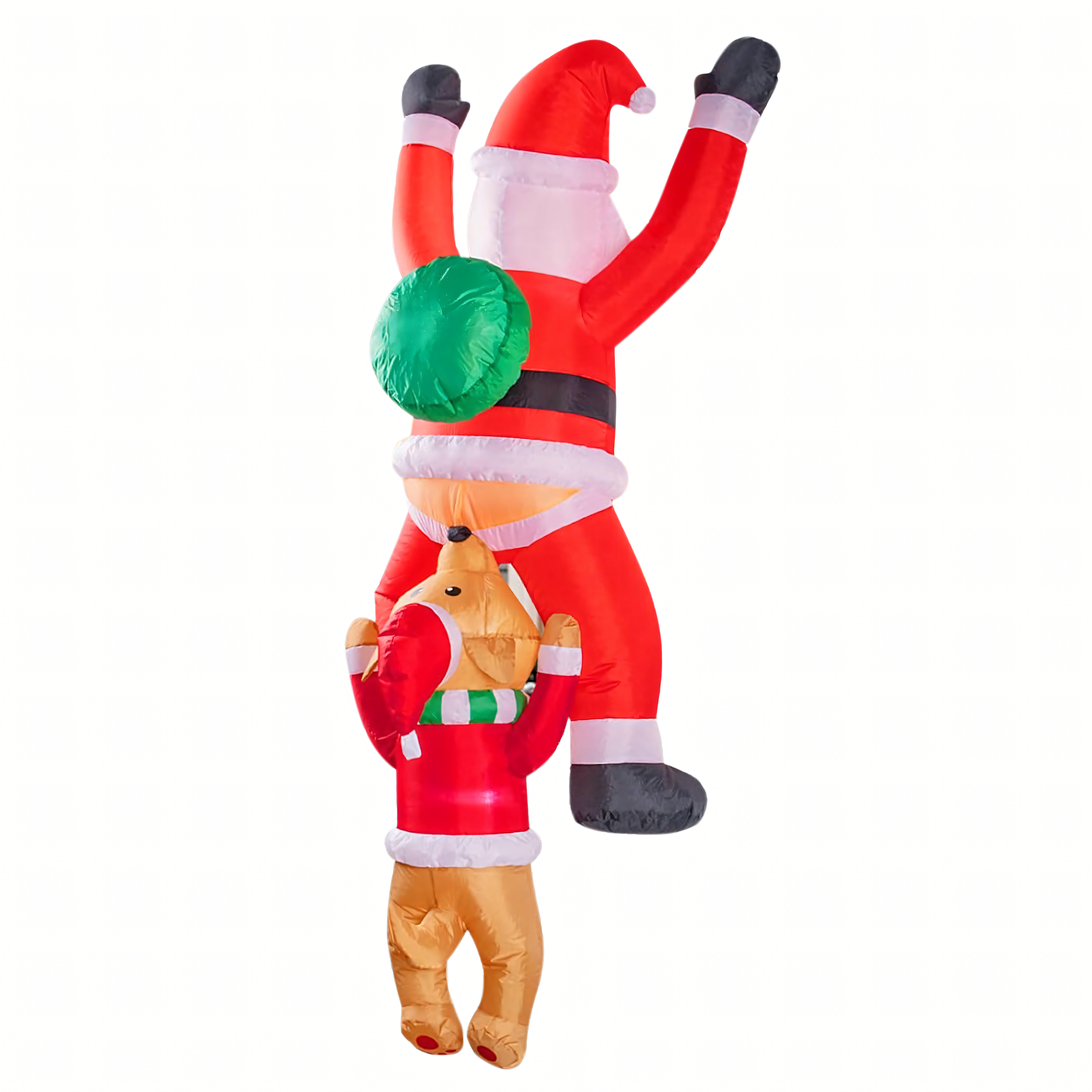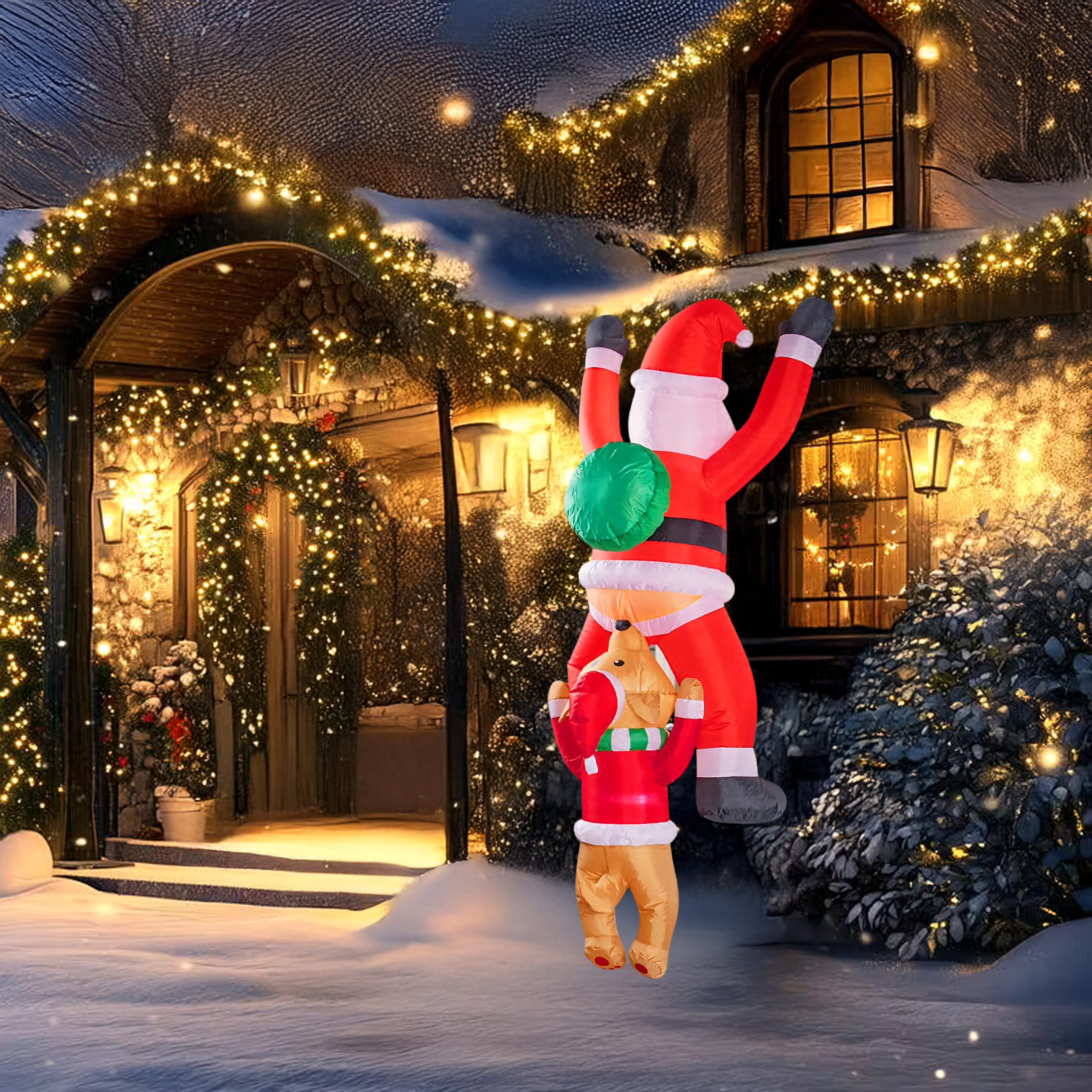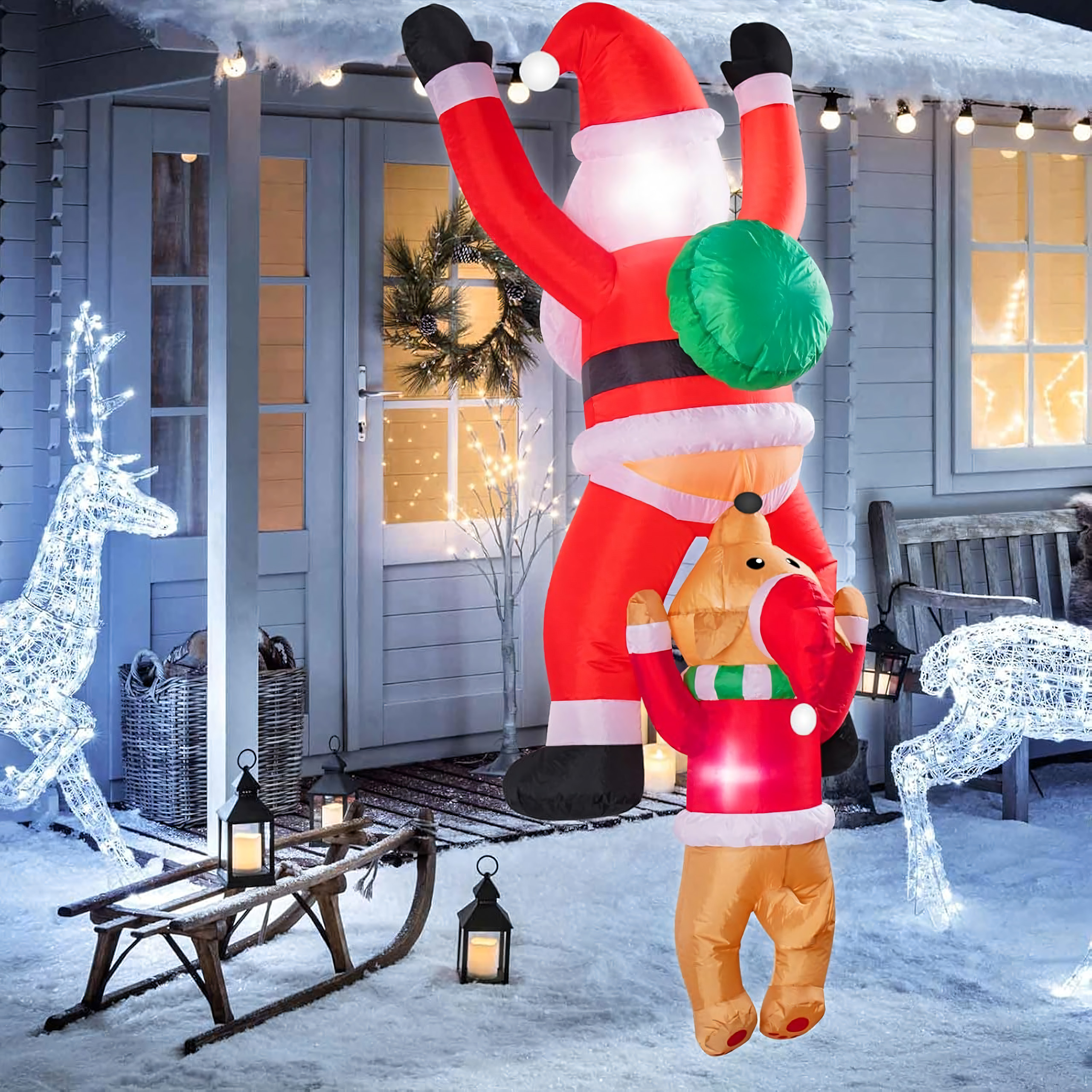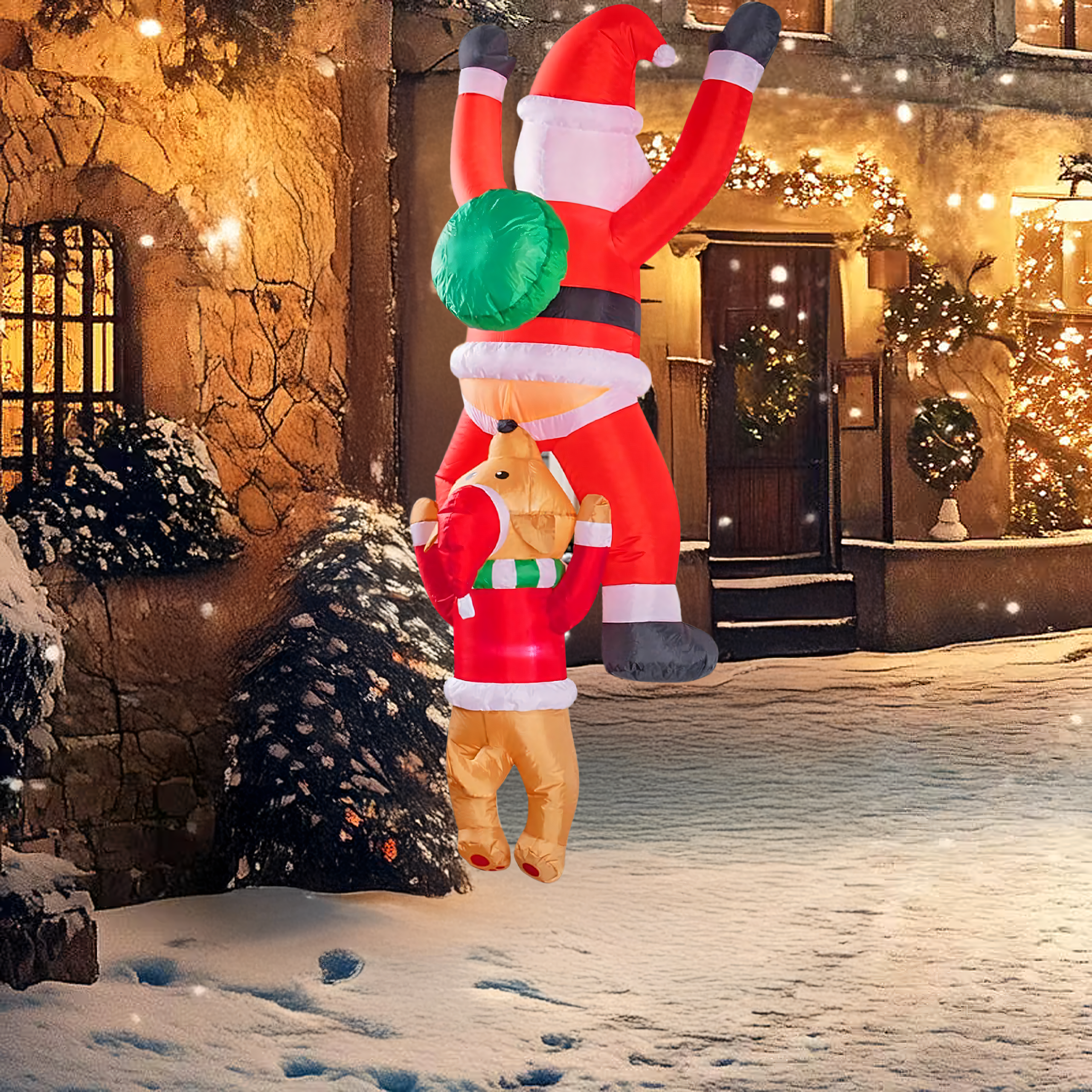 Dmuchany Święty Mikołaj zwisający z Reniferem 1,8 m to nietypowa, zabawna dekoracja świąteczna, która wniesie do Twojego domu i ogrodu wyjątkowy klimat. Dzięki wbudowanemu podświetleniu LED i kreatywnemu projektowi przyciąga spojrzenia i budzi uśmiech zarówno u dzieci, jak i dorosłych. Wykonana z wytrzymałej tkaniny poliestrowej, odpornej na warunki atmosferyczne – idealna do wnętrz i na zewnątrz.
