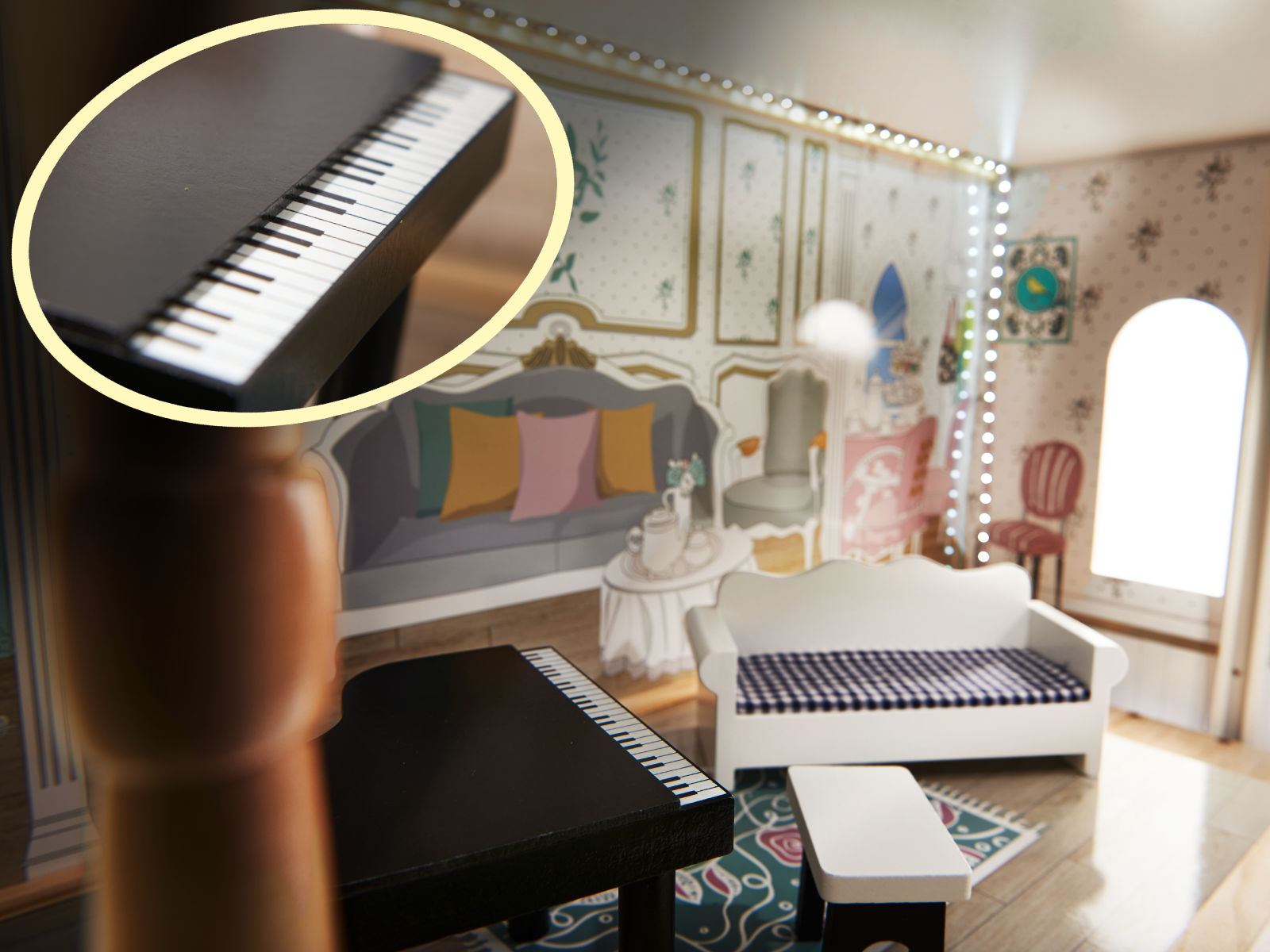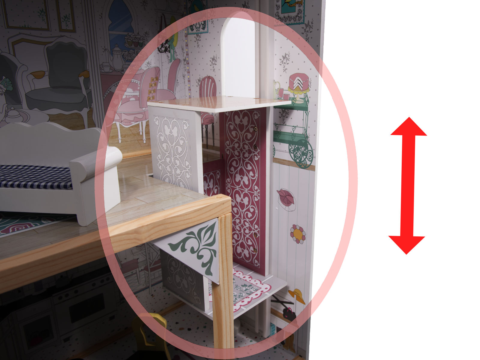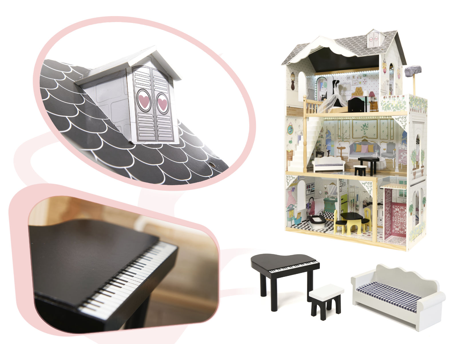 Ogromny, drewniany domek dla lalek do samodzielnego złożenia. Posiada 3 piętra z 4 pomieszczeniami z dodatkowym tarasem i windą. Ozdobiony kolorowymi obrazkami przedstawiającymi wyposażenie. W zestawie drewniane mebelki i taśma LED. Wysokość: 122cm.