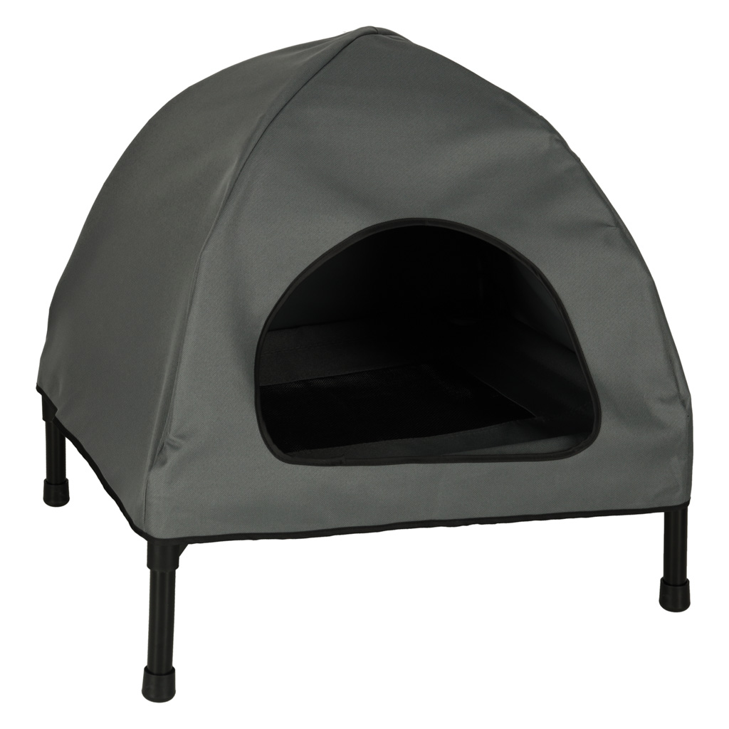 Materiał wykonania: wytrzymały poliester, metal. Kolor: szary i czarny. Całkowita wysokość (z nóżkami): 60 cm. Wysokość bez nóżek: 42 cm. Wysokość samych nóżek: 18 cm. Szerokość podstawy: 54 cm. podstawy: 44 cm. Wymiary wejścia: Szerokość: 31 cm. W