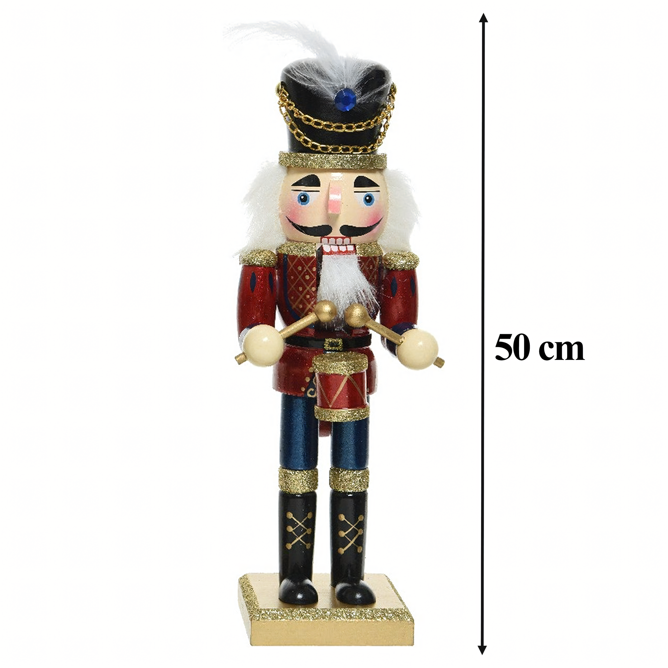 Drewniany Dziadek do Orzechów XXL 50 cm to elegancka i funkcjonalna figurka świąteczna, która łączy tradycję z praktycznością. Ręcznie malowana, wykonana z wysokiej jakości drewna, będzie piękną ozdobą wnętrza i pozwoli w klasyczny sposób rozłupywać orzechy.