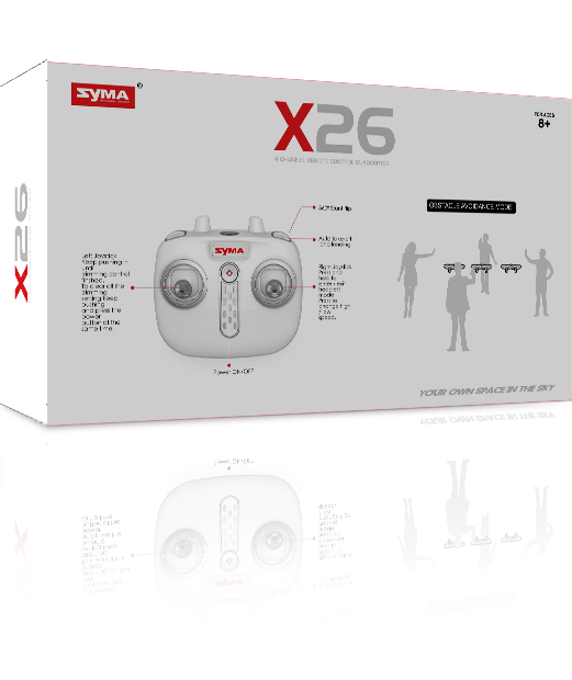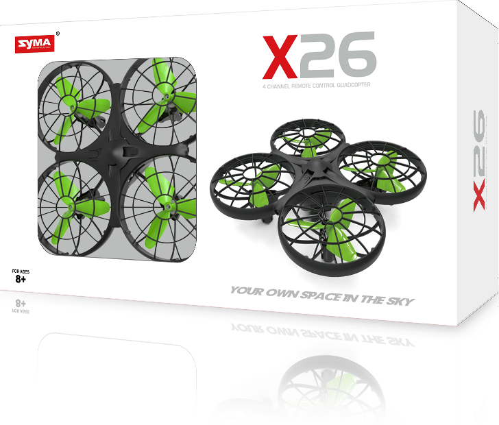 Wytrzymały dron Syma X26. Posiada system unikania przeszkód z 4 czujnikami, funkcję zawisu, tryb headless i funkcję automatycznego startu i lądowania. Akumulator 3,7V, 380mAh. Czas ładowania: ok. 90 min. Czas lotu: ok. 6 min. Zasięg: ok. 70m.