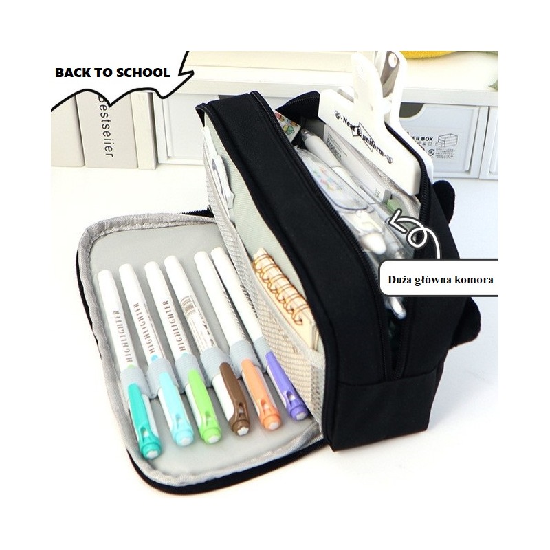 Pojemny, wielofunkcyjny dwukomorowy piórnik.