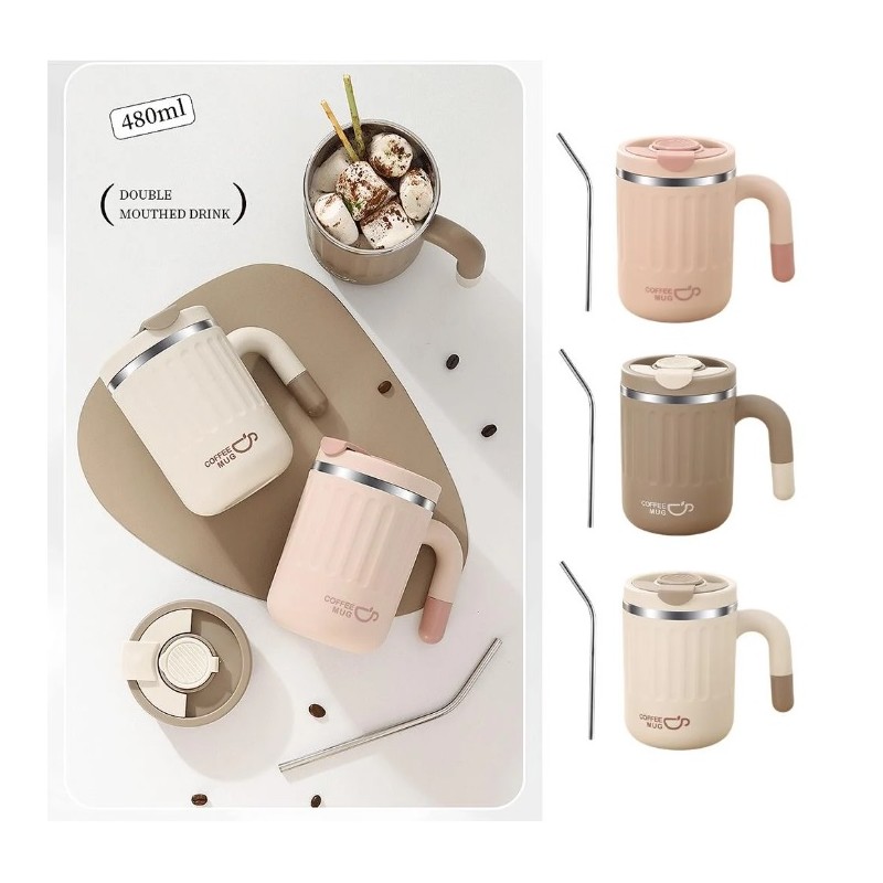DUŻY POJEMNY KUBEK TERMICZNY ze słomką 480 ml TERMOS zamykany COFFE CUP17BR
