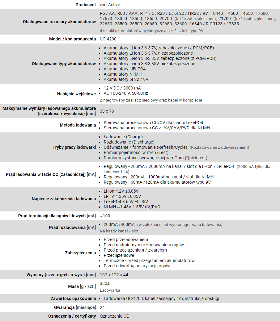 EVERACTIVE ŁADOWARKA DO AKUMULATORÓW CYLINDRYCZNYCH LI-ION ORAZ NI-MH UC4200