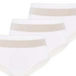 Trójpak majtek damskich siateczkowych w kolorze białym z wysokim stanem. Majtki w wielopaku są mocniej zabudowane, kryją całe pośladki, jednocześnie w seksowny sposób odkrywając je. W okolicach kroku od wewnętrznej strony jest podszycie bawełniane dla utrzymania świeżości. Zestawy majtek są najbardziej pożądanymi na rynku i chętnie nabywanymi z racji korzystnej ceny.