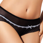 Seksowne figi typu brazyliany częściowo odsłaniają pośladki. Piękne, kwieciste boki wyglądają wspaniale. Przód cały gładki. Nasz bestseller!