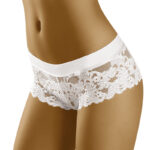 Prawdziwa perełka pośród bieliźnianych propozycji. Eleganckie, pięknie skrojone figi, zwieńczone śliczną koronką. Ta (dla odmiany) zmysłowo pnie się po pośladkach, czarując spojrzenie. Przód gładki, jedynie z koronkową lamówką wokół ud. Fason typu „biodrówka” – sexy! Figi zdecydowanie warte polecenia!