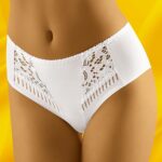 Eleganckie figi, w których na szczególną uwagę zasługują piękne, koronkowe dopełnienia zdobiące okolice ud. Nieco pełniejsze, o elastycznych właściwościach. Wyróżnione modną, paseczkową mozaiką, która figlarnie zdobi przód bielizny.