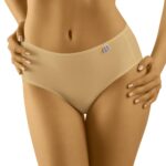 Bawełniane figi o wyższym kroju, zdobione przy udach koronką i ciekawym, transparentnym tiulem w paski. Te dwa desenie zestawione z wygodną, gładką tkaniną wspólnie tworzą niebanalną aranżację, dzięki którym biodra prezentują się elegancko i zgrabnie. Krój delikatnie modeluje brzuszek.