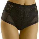 Gładkie, modelujące sylwetkę, wysokie figi z elementem prześwitu. Wyposażone w delikatne, silikonowe wzmocnienie w górnej części, dzięki któremu figi nie zsuwają się z ciała. Fajnym pomysłem są prześwity po bokach bioder (i na pośladkach) przełamują utarte standardy, pokazują, że bielizna, która potrafi wysmuklić i poprawić linię ciała może być także kobieca, delikatna i nieco sexy. Polecamy!