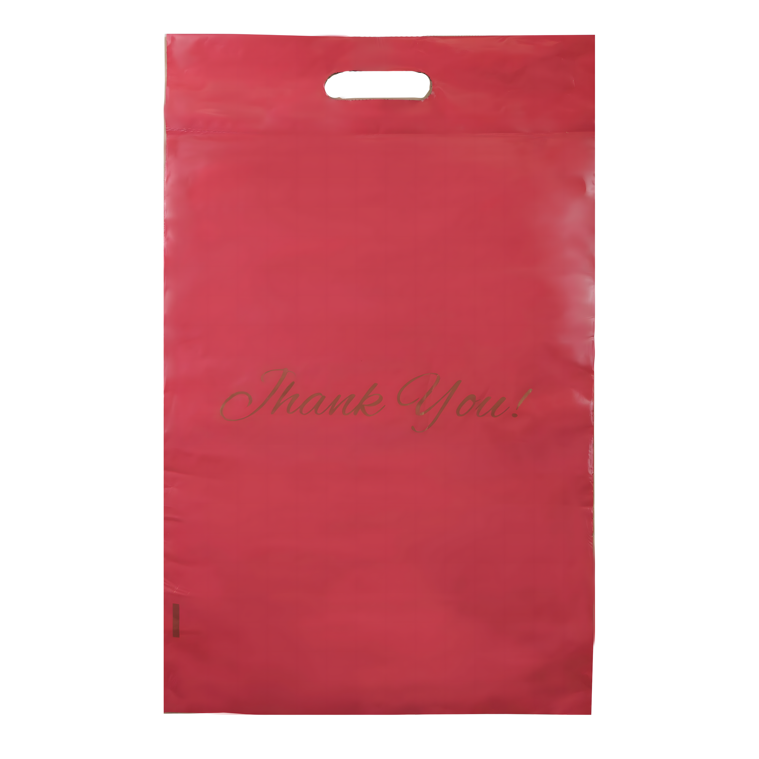 FOLIOPAK KURIERSKI FOLIOPAKI CZERWONE z RĄCZKĄ 310 x 420 + 70 mm (rączka) 50 szt z napisem „Thank You”