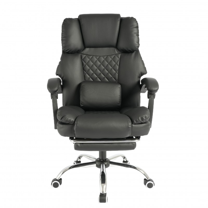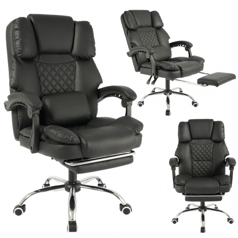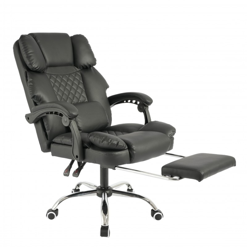 KOMFORTOWY FOTEL BIUROWY Z PODNÓŻKIEM I MASAŻEREM Z KOŃCÓWKĄ USBSpecyfikacja fotelaKolor: czarnaMateriał: ekoskóra, pianka EPEWymiary: na zdjęciuMaksymalne obciążenie 150 kgWaga 15,5 kgWymiary opakowania: 74 x 32,5 x 59 cmCechy:- siedzisko, wypełnione miękką podwójną gąbką- poduszka z masażerem- regulacja kąta odchylenia oparcia wraz z blokada- stabilna i wytrzymała pięcioramienna podstawa- wysokiej jakości kółka plastikoweREGULACJA – fotel posiada regulacje wysokości siedziska. Dzięki temu możesz dostosować jego wysokość do swoich indywidualnych potrzeb co jest niewątpliwą zaletą. Możliwość regulacji odchylenia fotela, (90 -155 stopni) gwarantuje Ci chwilę relaksu i rozluźnienia.Pokrycie – szerokie siedzisko, oparcie, zagłówek oraz wierzchnia strona podłokietników powleczone ekoskórą oraz zastosowanie pianki EPE.